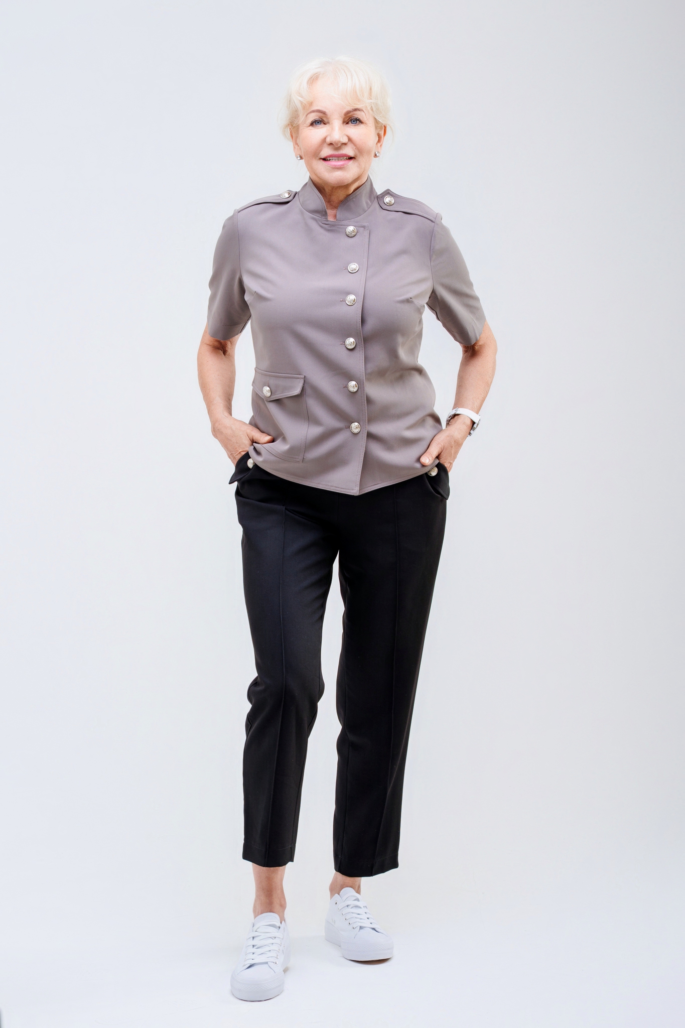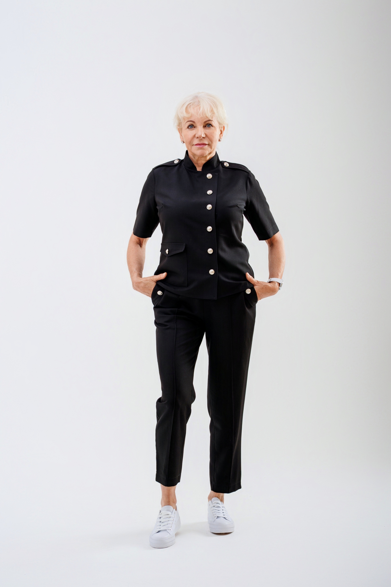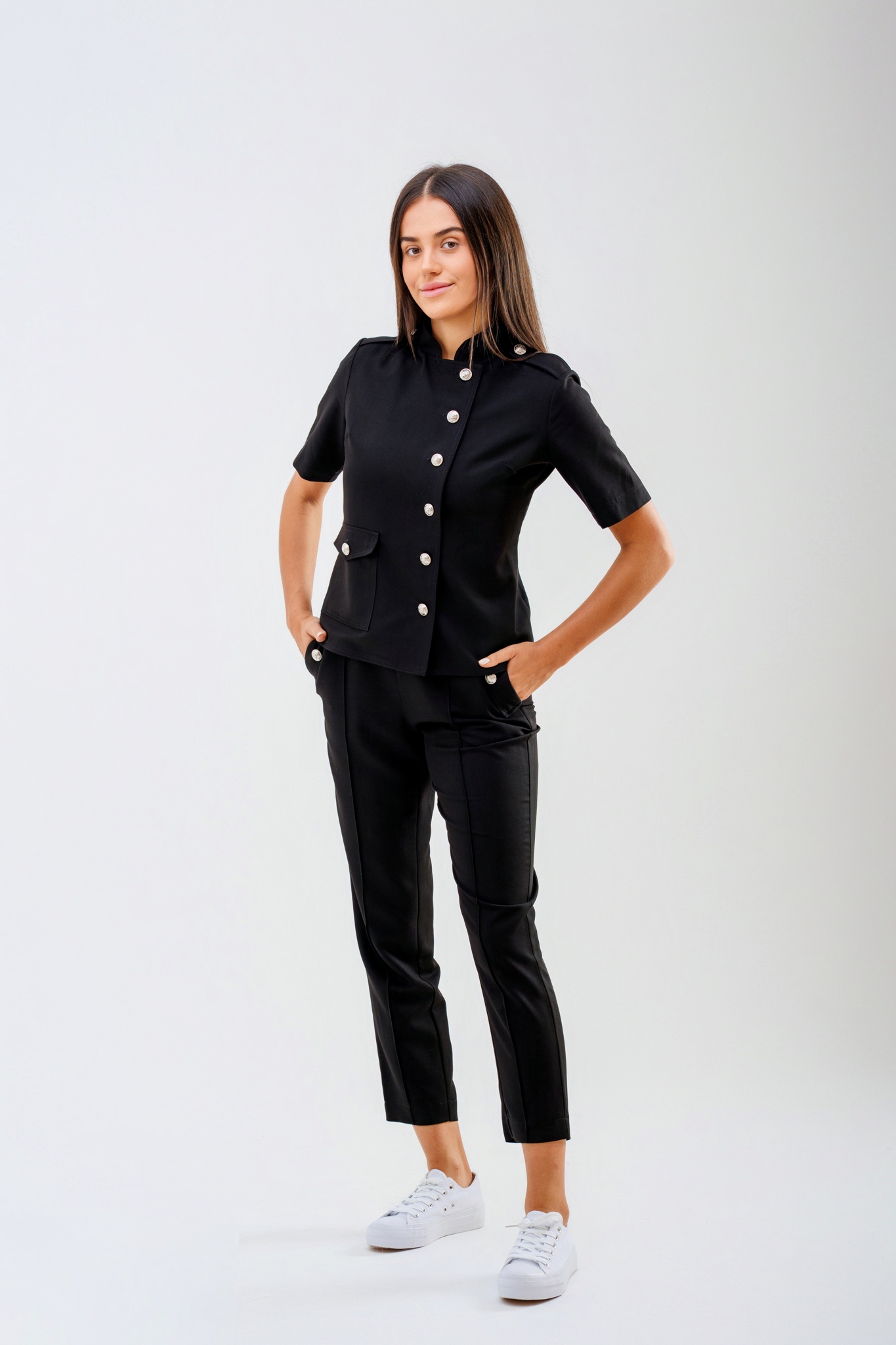 Elegancki komplet Cleo dostępny jest w dwóch wariantach: z kieszonką lub w wersji bez kieszonki. Klasyczny, wygodny fason zapewnia komfort noszenia i ponadczasowy wygląd. Marynarka została częściowo odszyta podwójnie, co znacząco ogranicza powstawanie zagnieceń podczas użytkowania. Całość dopełniają stylowe metalowe guziki dostępne w kolorze czarnym lub srebrnym, podkreślające elegancki charakter kompletu.