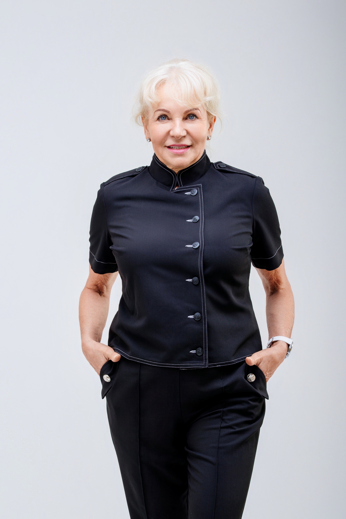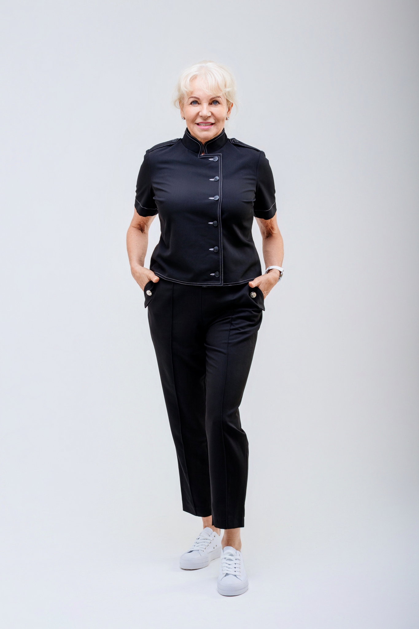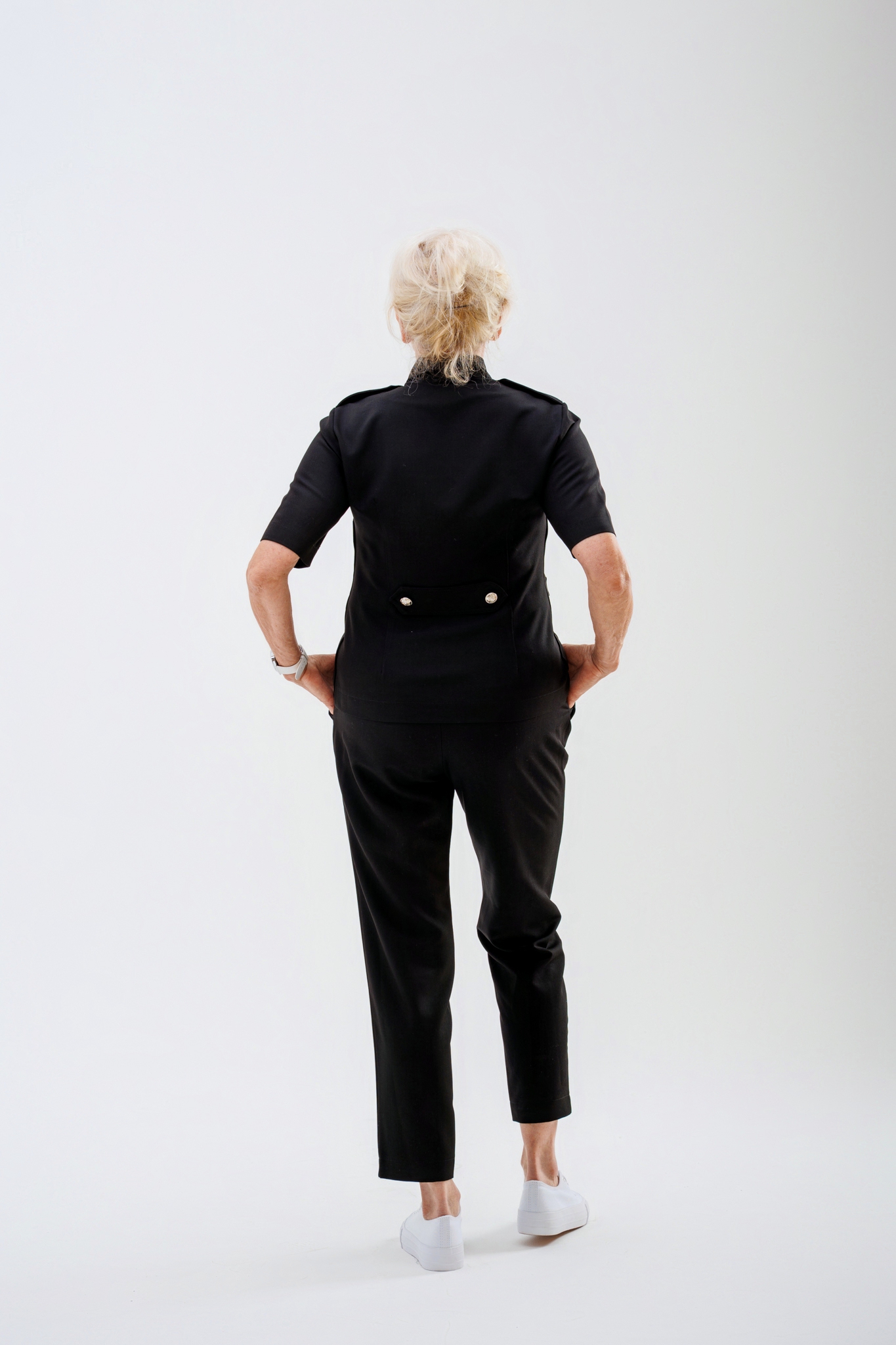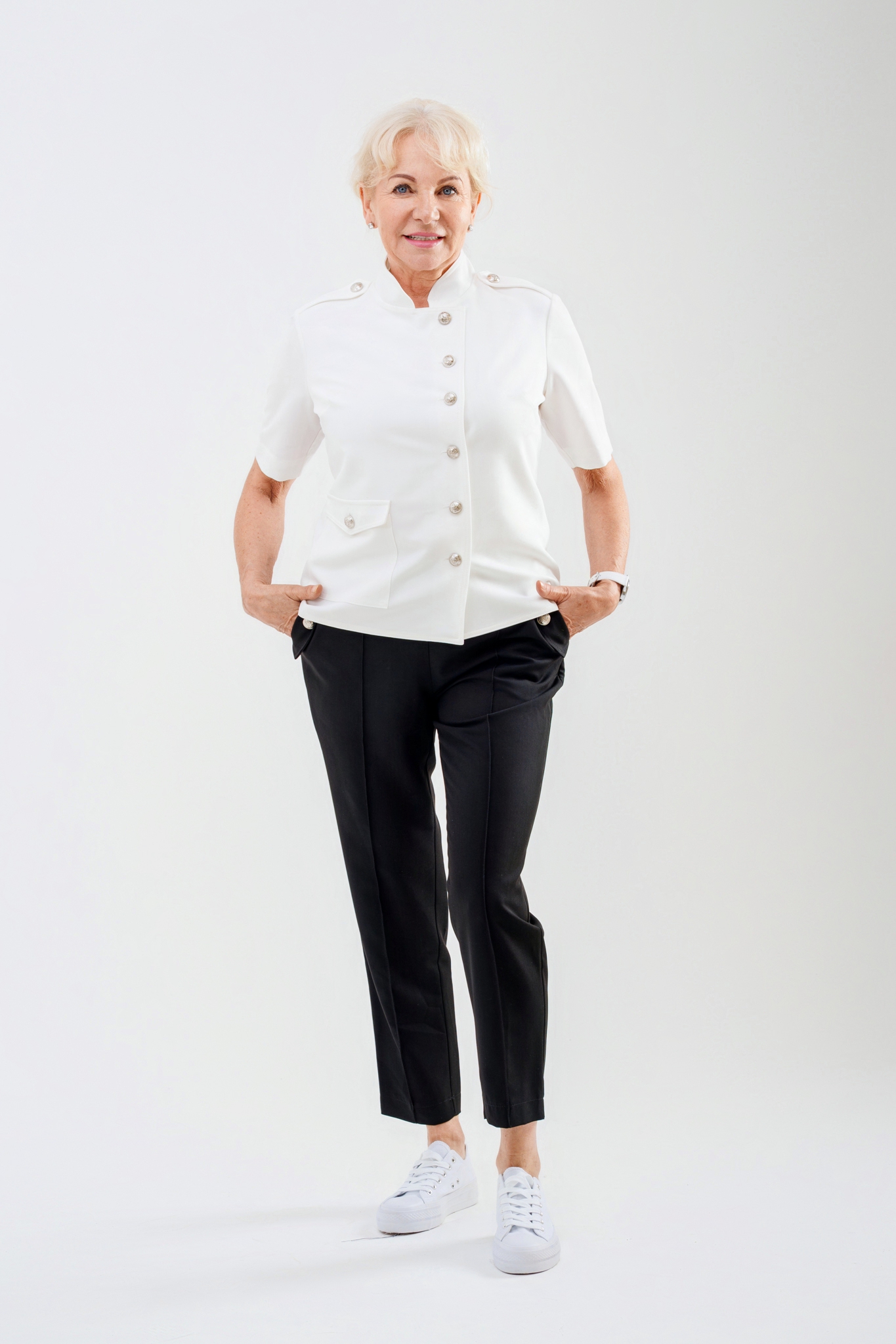 Elegancki komplet Cleo dostępny jest w dwóch wariantach: z kieszonką lub w wersji bez kieszonki. Klasyczny, wygodny fason zapewnia komfort noszenia i ponadczasowy wygląd. Marynarka została częściowo odszyta podwójnie, co znacząco ogranicza powstawanie zagnieceń podczas użytkowania. Całość dopełniają stylowe metalowe guziki dostępne w kolorze czarnym lub srebrnym, podkreślające elegancki charakter kompletu.